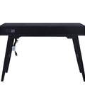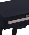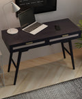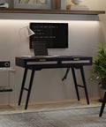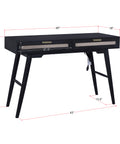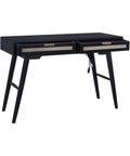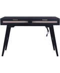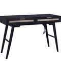 The Modern Linen desk features a solid mango wood desktop encasing two drawers with linen insert panel detail supported on slanted legs. This blend of timeless mid-century modern and coastal style includes a convenient built-in outlet to cater to the demands of contemporary living.